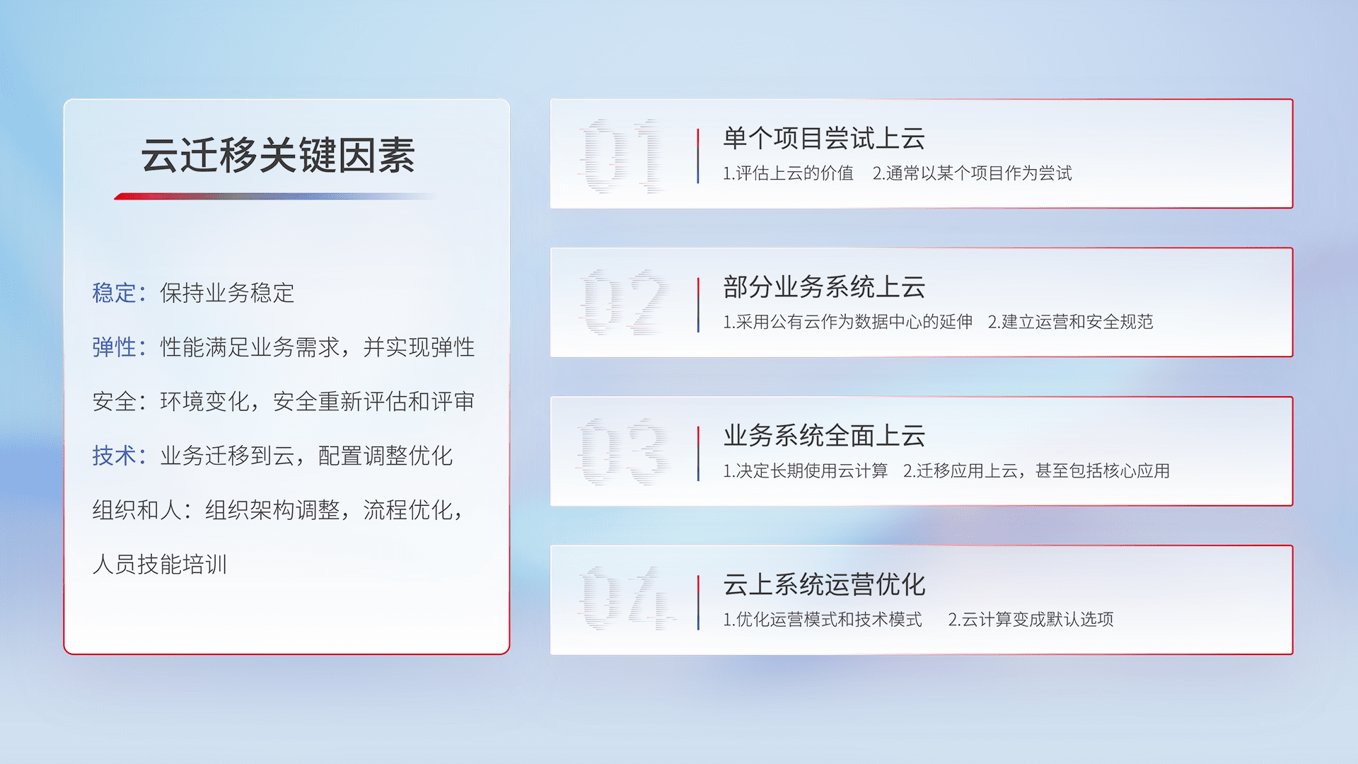 结合实际业务,,,,从规划设计、、云平台选型、、云原生改造、、、数据迁移、、、集成交付,,,,迁移全过程为客户识别最佳上云路径,,做好风险识别管理,,,设计网络架构、、、身份权限、、安全审计合规、、、、操作审计、、日志审计、、、监控告警策略、、多站点容灾设计等,,,对云上基础设施进行整体规划,,,提升IT治理水平,,,,以满足弹性、、、高可用、、、、高性能的需求。。。。