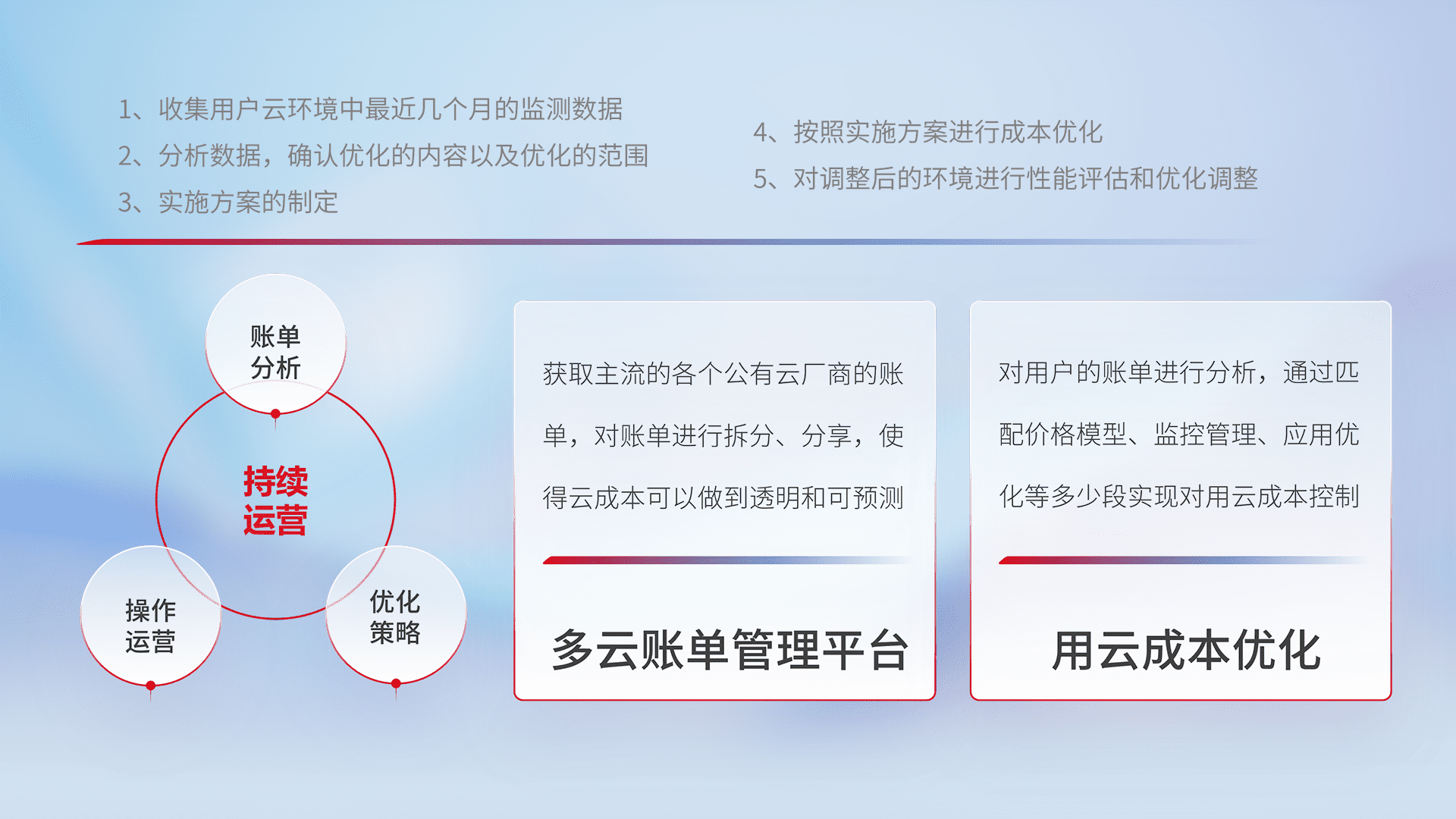 通过多云纳管,,以统一的资源数据模型把客户的云资源进行抽象和封装,,进而实现对多云资源的统一操作,,,,保障云资源管理的可靠性、、、、稳定性与可用性。。。。量身定制化运维内容,,配置、、开发运维、、补丁管理、、备份、、、监控、、认证和访问管理、、审计和日常巡检等,,,,保障在用云过程中的可靠度,,,,稳定度以及高可用率。。。